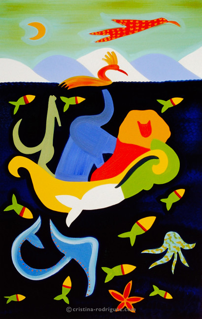 I first experienced Cristina’s paintings at her 1997 exhibition ‘The Carnival of the Animals’. I was 15 years old, with little knowledge or interest in art. I vividly remember walking into the Pump House Gallery in London’s Battersea Park – I stopped for a moment and, immediately enthralled, spun on my feet, trying to take in all the paintings in the room. I stopped on Sailing Through the Seventh Sea, captivated by the boldness of its colours and moved by the shared journey of this unlikely collection of travellers: a lion, a monkey, an elephant, a bird, the luminescent stingray and graceful octopus, and the curious and playful school of green and yellow fish coming along for the ride. In all the years that have passed since that day, whenever I have thought of Cristina and of her paintings, it is the image of Sailing Through the Seventh Sea that I have held in my mind, and the feelings of wonder and joy of that beautiful day at the Pump House Gallery.